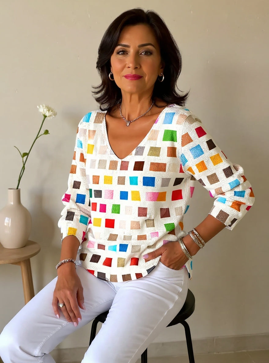 de Kleurrijke trui met V-hals is de perfecte trui voor vrouwen die een vleugje kleur en vrolijkheid aan hun garderobe willen toevoegen. De flatterende V-hals benadrukt de silhouette, terwijl de zachte stof een onweerstaanbaar comfort biedt. Met zijn levendige tinten en verfijnde ontwerp, de Kleurrijke trui met V-hals combineert warmte, elegantie en moderniteit — de ideale metgezel om uw frisse dagen op te vrolijken.